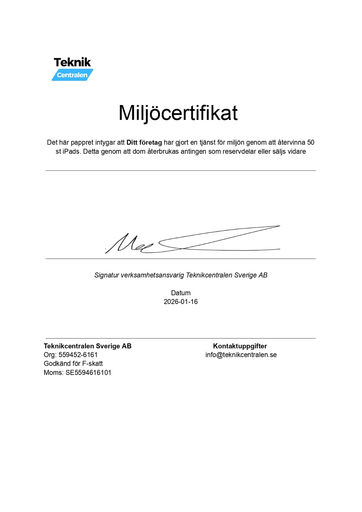 När erat företag väljer att återvinna sina produkter via oss så ger vi självklart ett Miljöcertifkat som intygar att ni har gjort en tjänst för miljön
